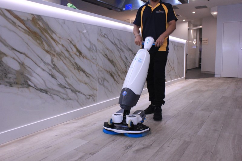 Small scrub head and skinny machine body to move around furniture, benches and rackings; accessible in the narrowest of spots.
